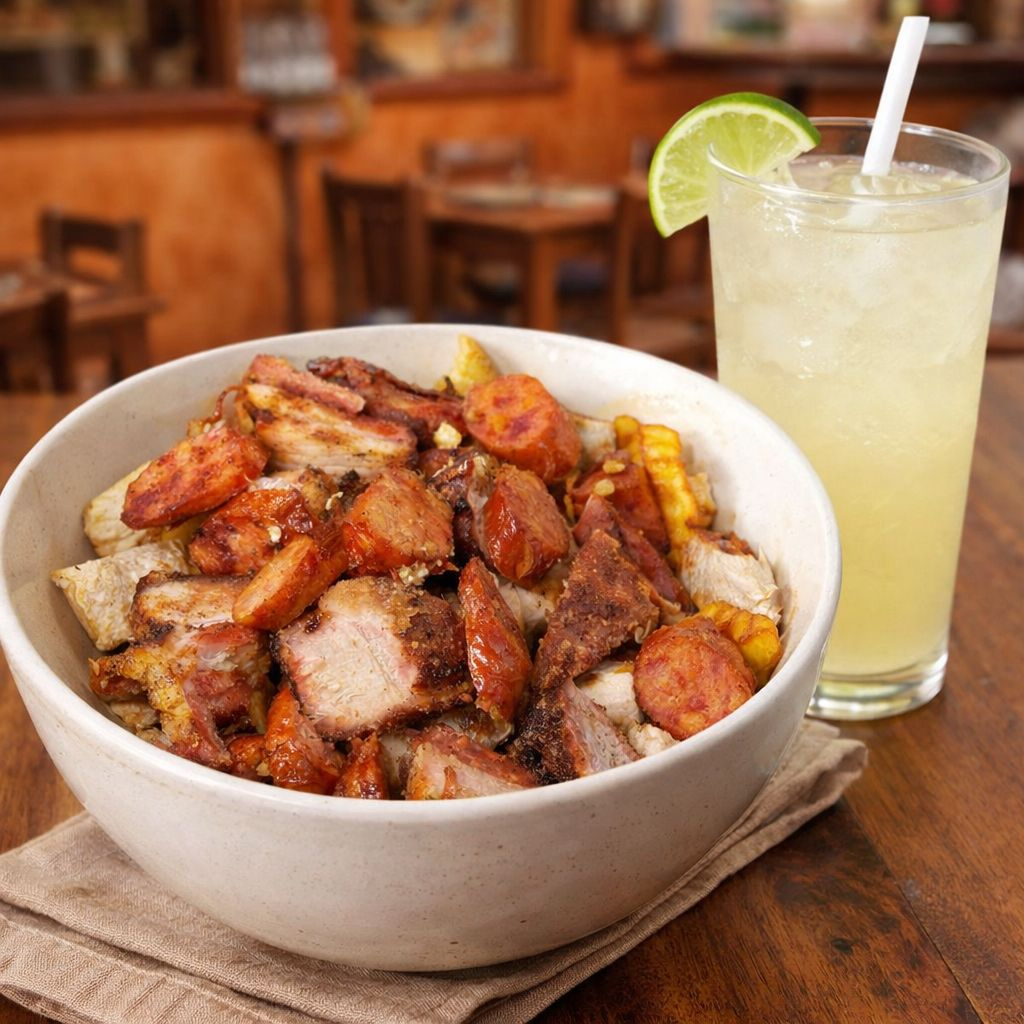 Deliciosa picada personal de cerdo acompañada de chorizo, papas de la casa, salsas de la casa & deliciosa limonada natural