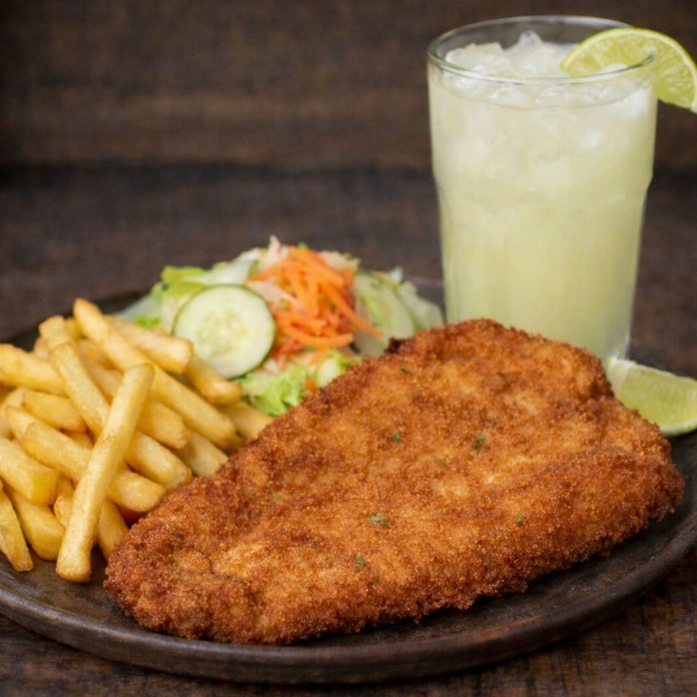 Delicioso filete de lomo de cerdo apanado, acompañado con papas rizadas en casco, ensalada de la casa tropical y deliciosa limonada natural ( 16 onz )