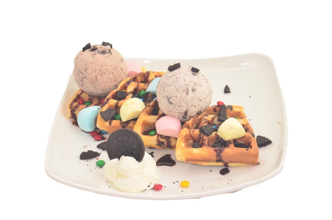 Waffle con helado, banano, salsa de chocolate, chantilly, queso y cereza.