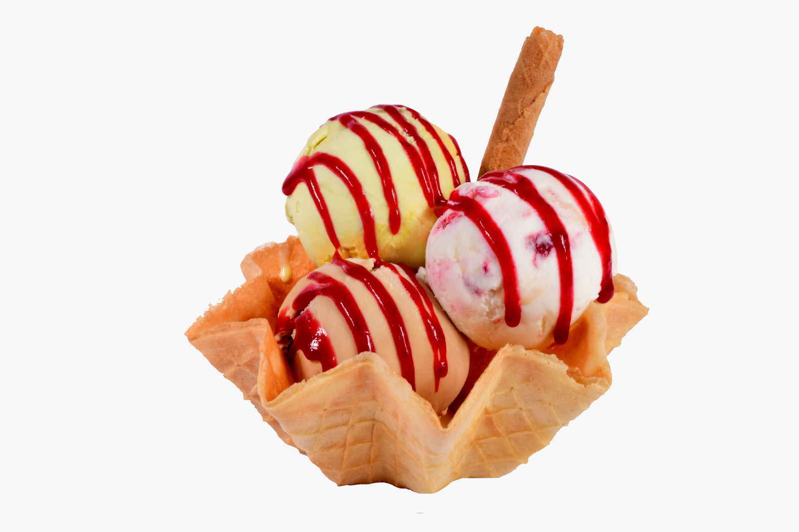 Tres bolas de helado, queso, salsas, chantilly, galleta barquillo y cereza