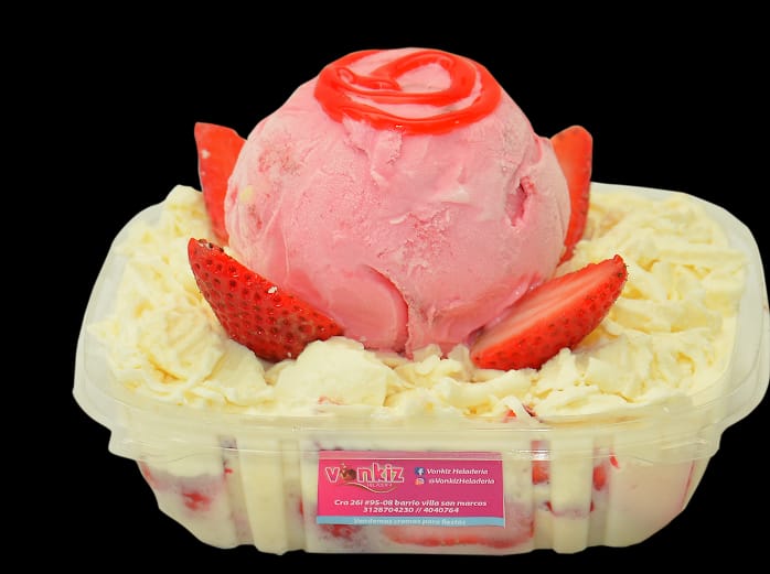 Fresas con crema 12 onz, fresas, crema batida, salsa, galleta crujiente y quipitos.
