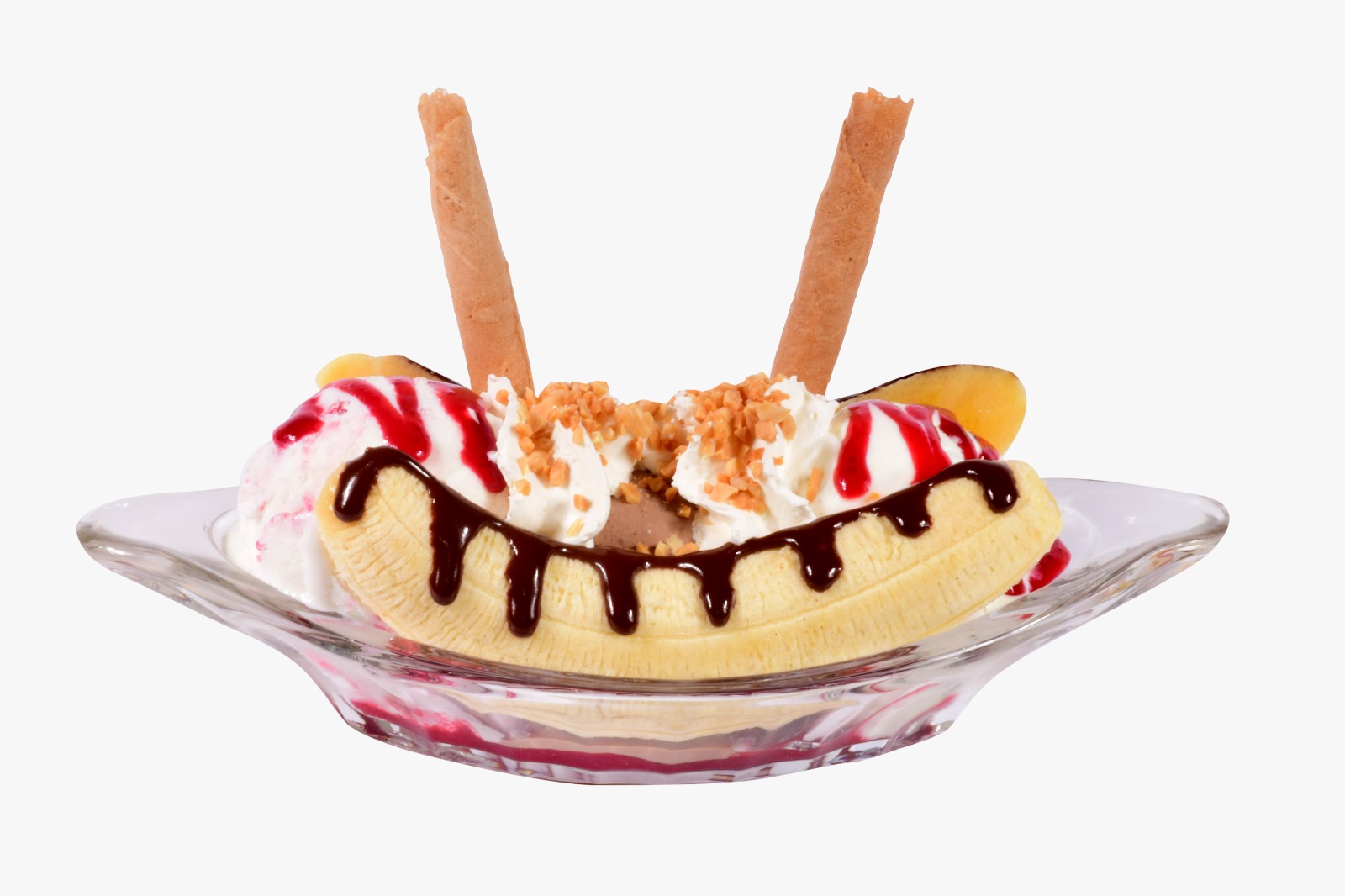 Tres sabores de helado, banano, salsa, chantilly, cereza, barquillo.