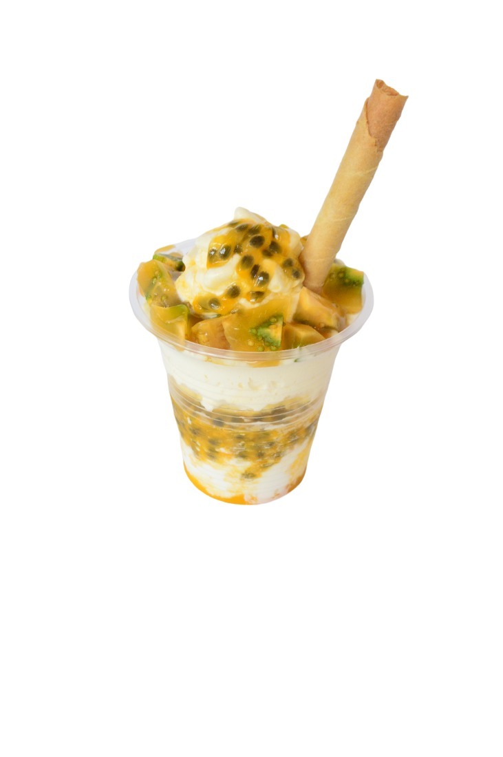 Dos sabores de helado, pulpa de lulo, crema de leche, barquillo.