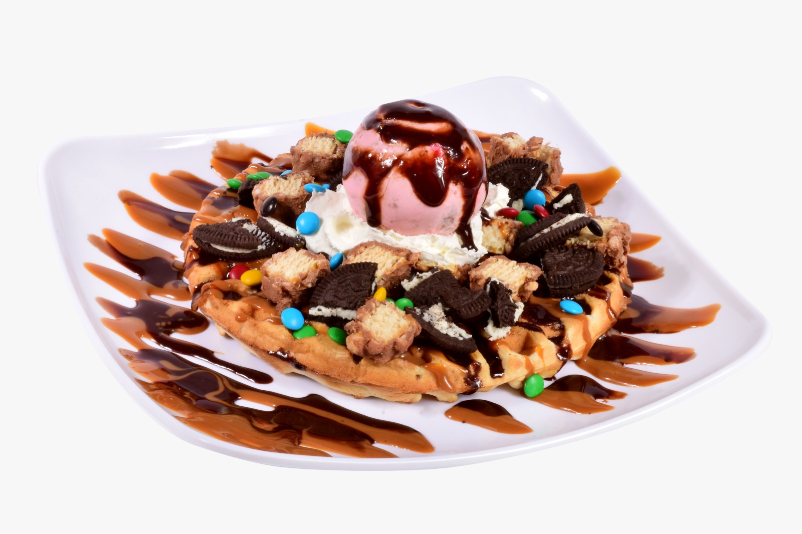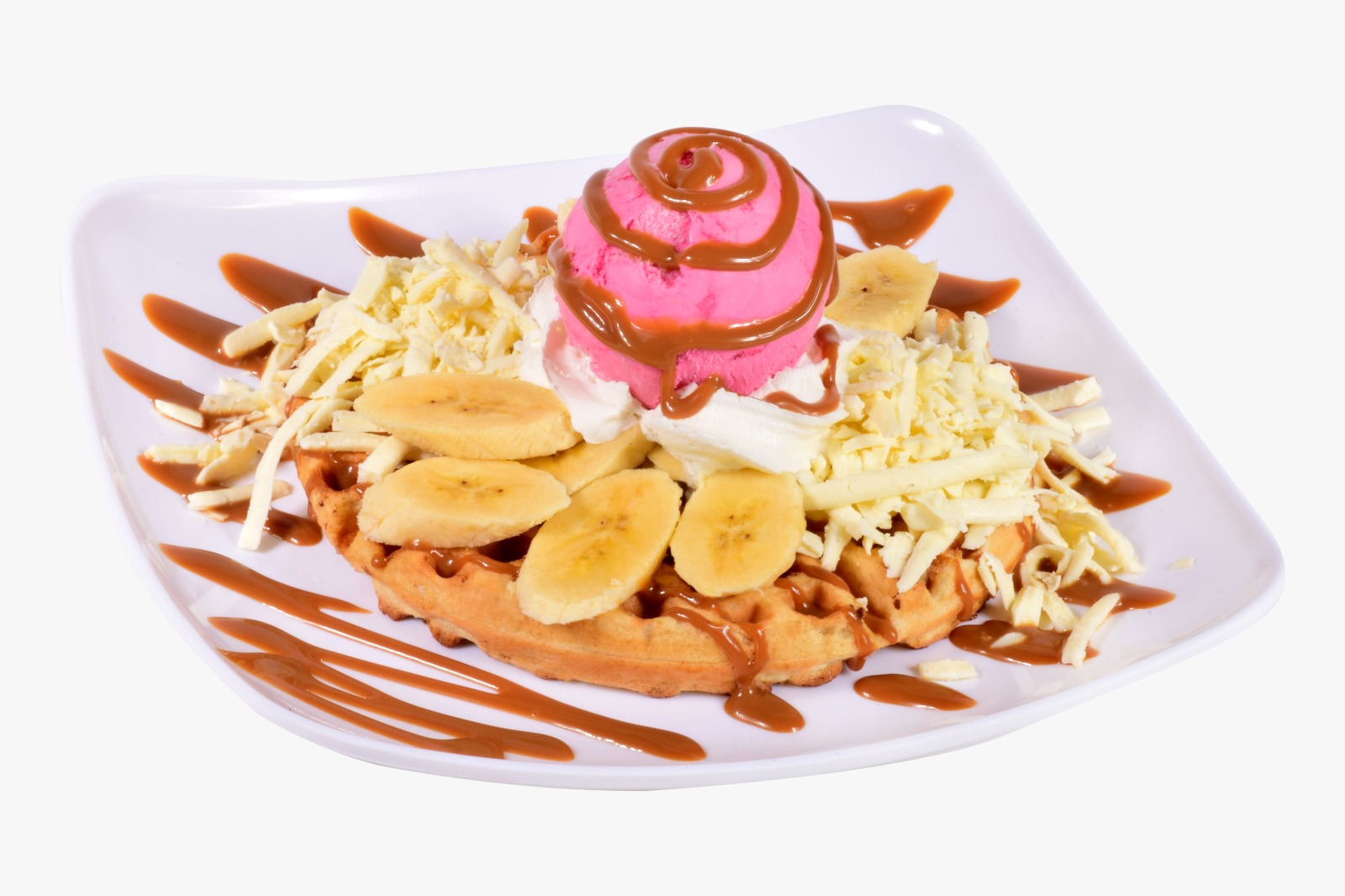 Waffle con helado, banano, salsa de chocolate, chantilly, queso y cereza.