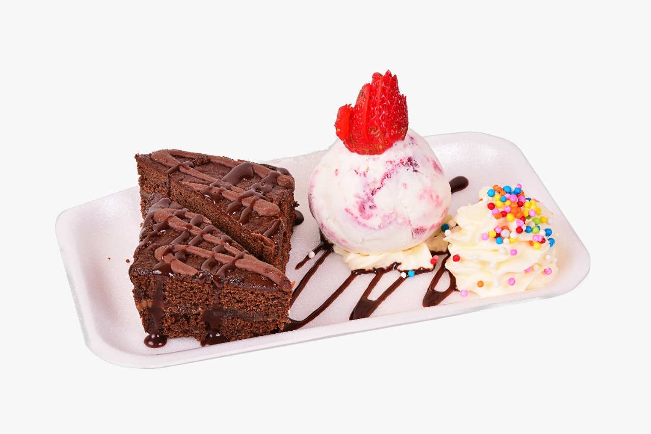 Un sabor de helado, brownie, salsa de chocolate, chantilly.