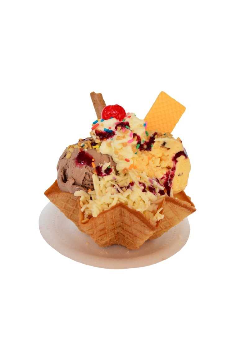 Dos sabores de helado, salsa de mora o arequipe, chantilly, barquillo.