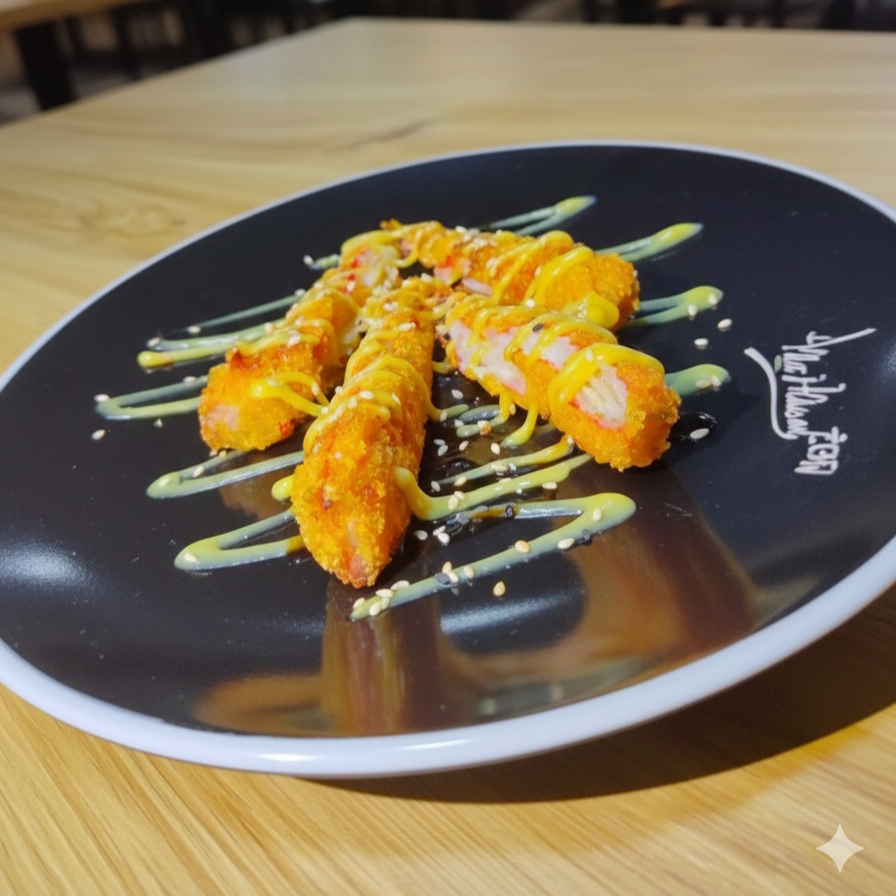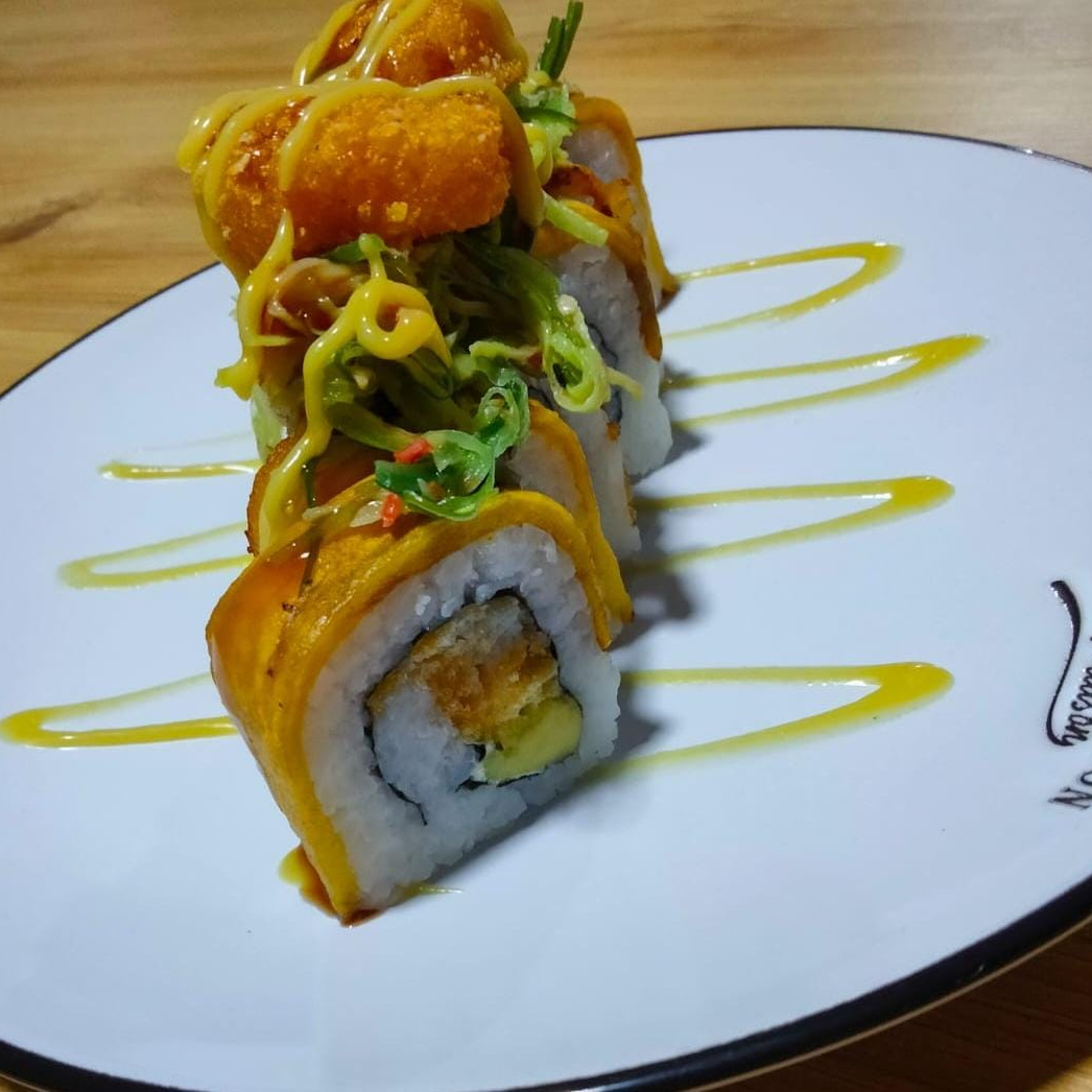 Sushi apanado acompañado de camarón, palmito, aguacate, queso crema, salsa de la casa.