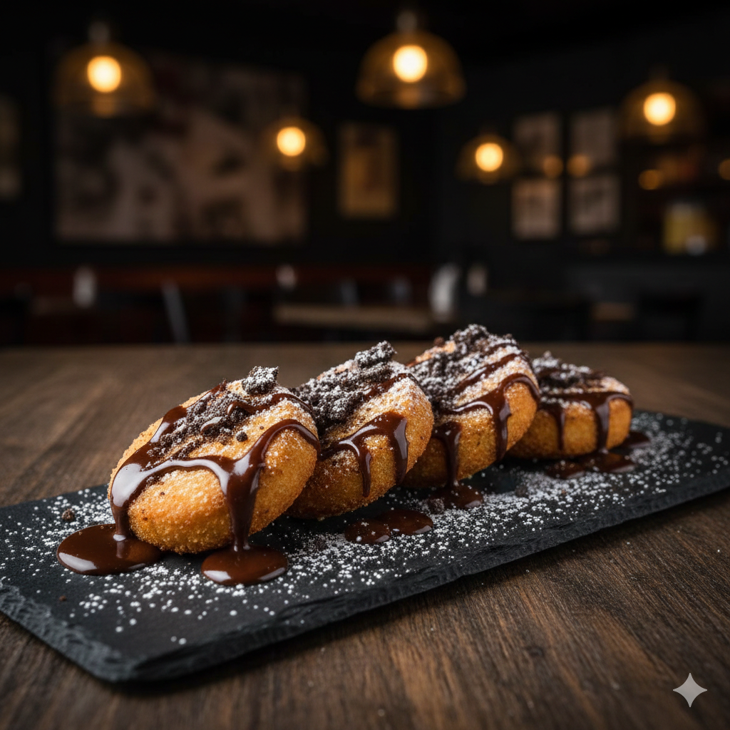 4 Galletas apanadas bañadas en sirope de chocolate.