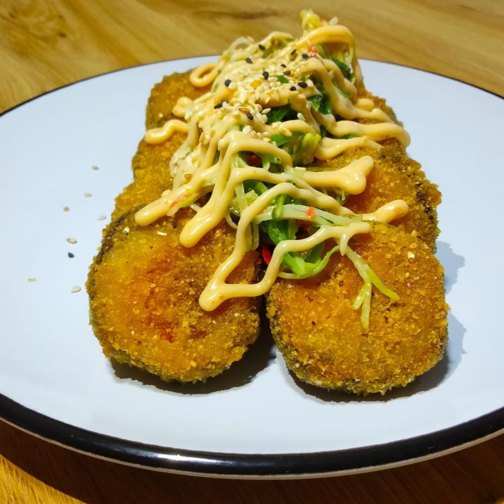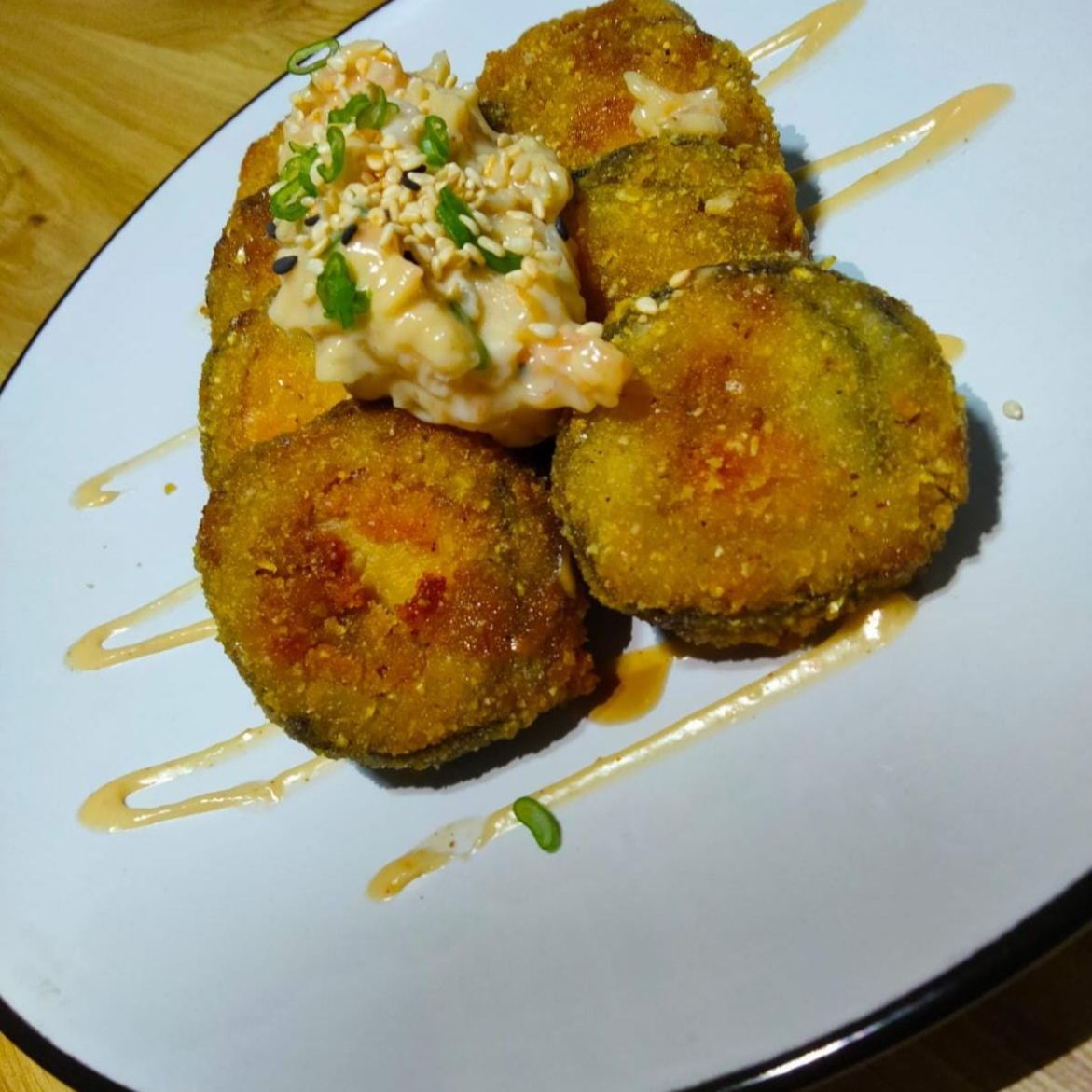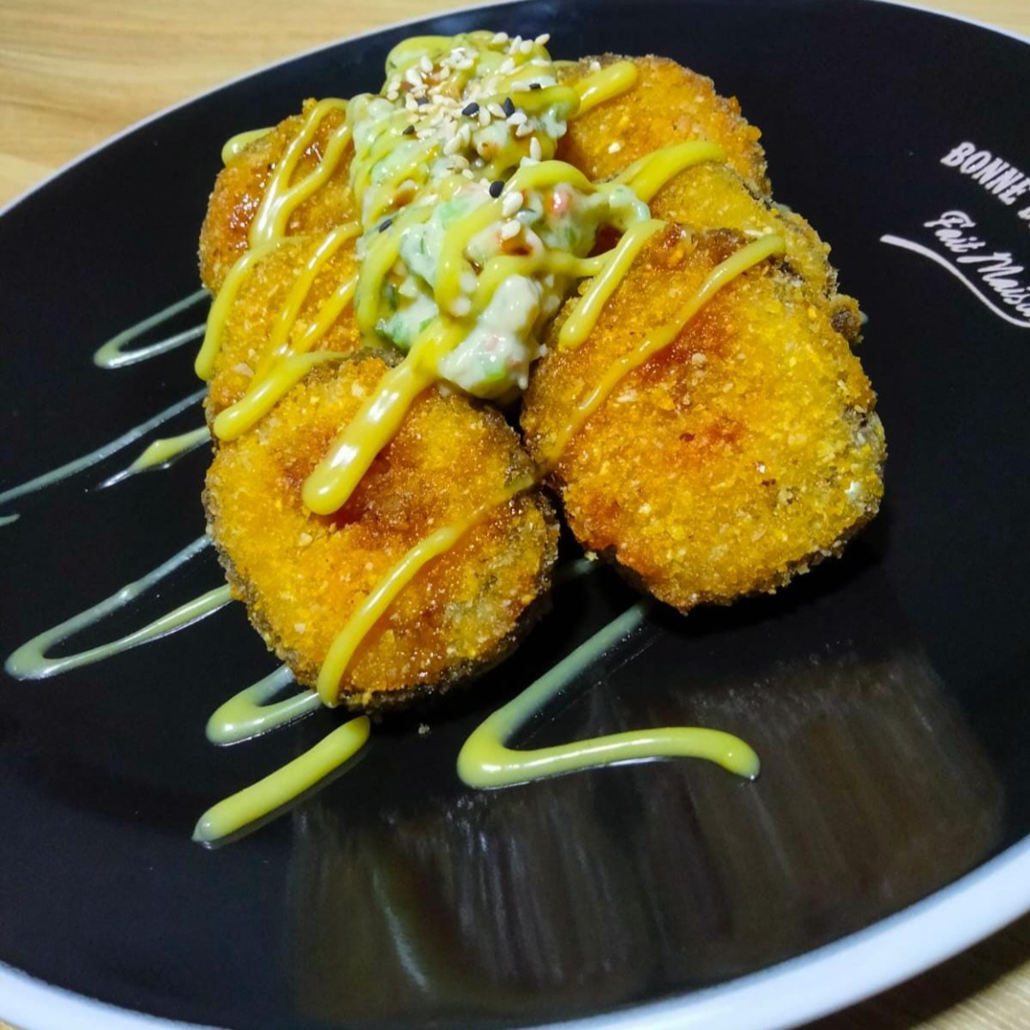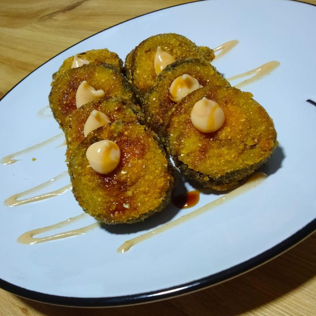 apanado bocado a bocado relleno de palmito y platano maduro aguacate y queso crema toping de salsa dinamita. Acompañado de 1 salsa teriyaki 1oz