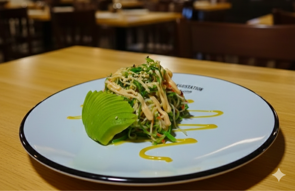 Relleno de pepino aguacate queso crema ensalada de palmito y toping de caviar masago