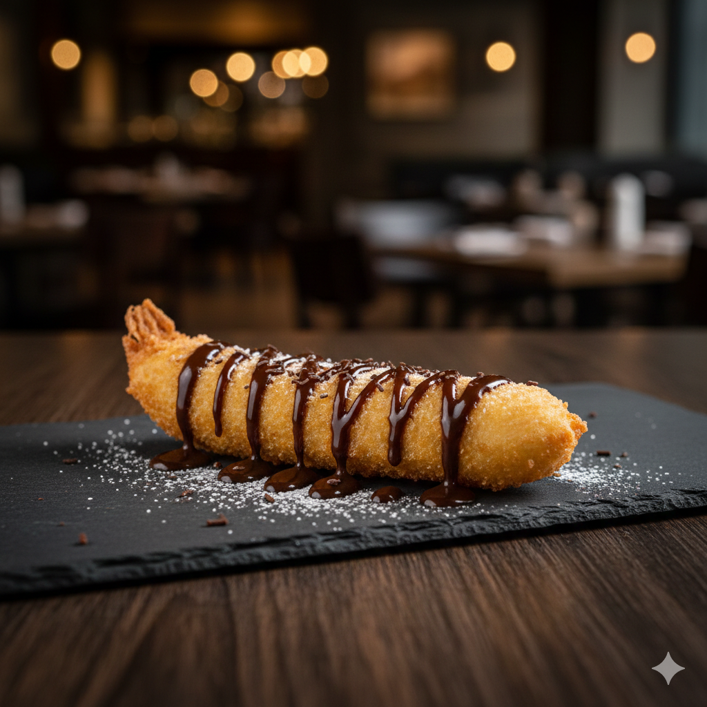 Banana tempurizada, bañada en sirope de chocolate.