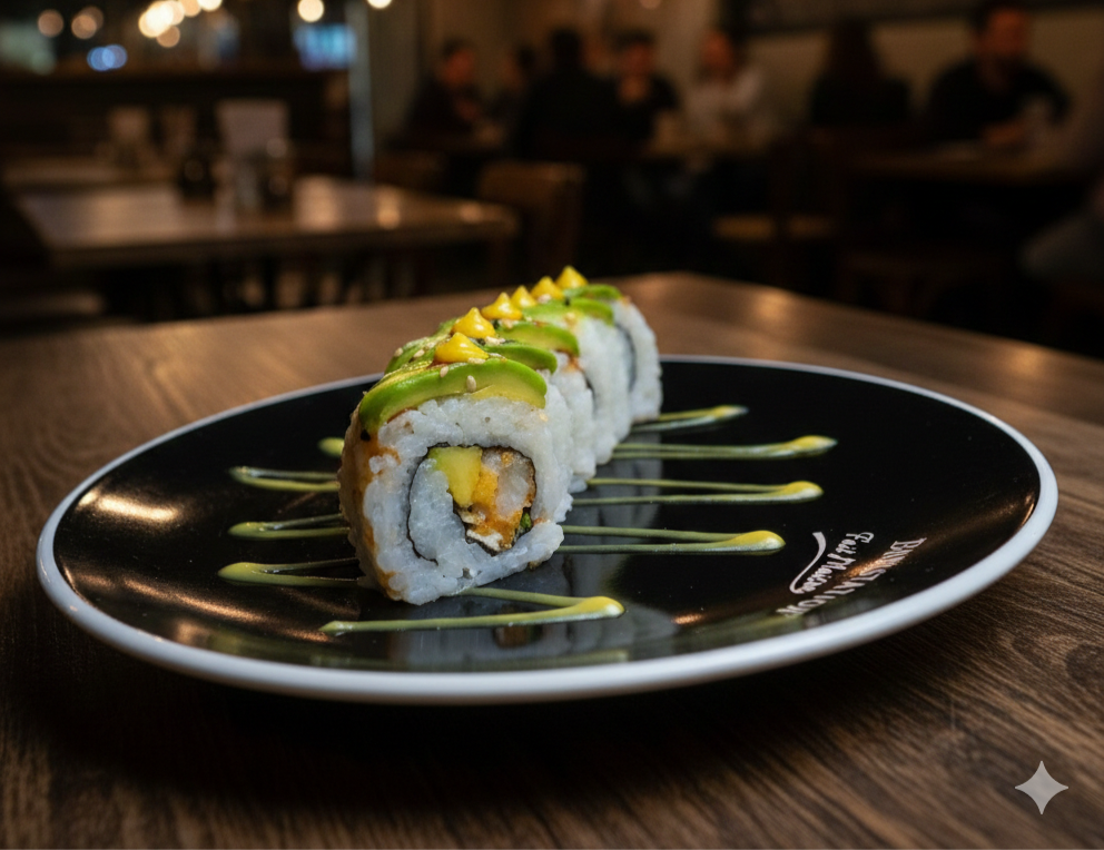 Delicioso sushi acompañado de palmito, maduro, aguacate, queso crema, salsa dinamita de la casa.
