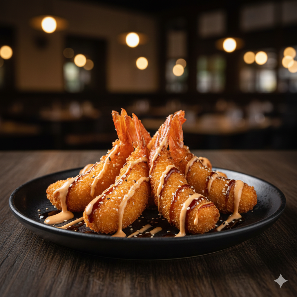 6 und de deliciosos camarones apanados bañados en salsa fuji y teriyaki
