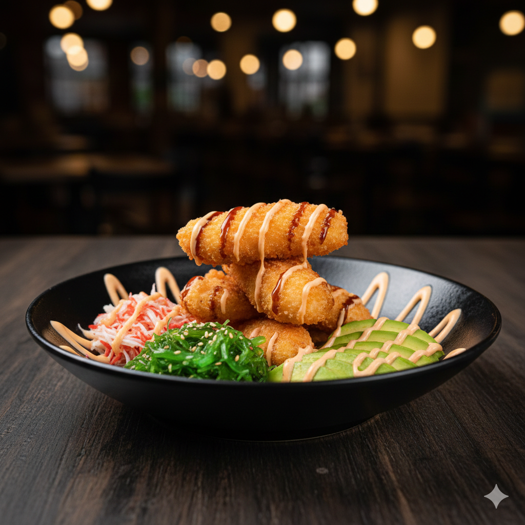 deliciosa ensalada dinamita acompañada de camaron tempura
