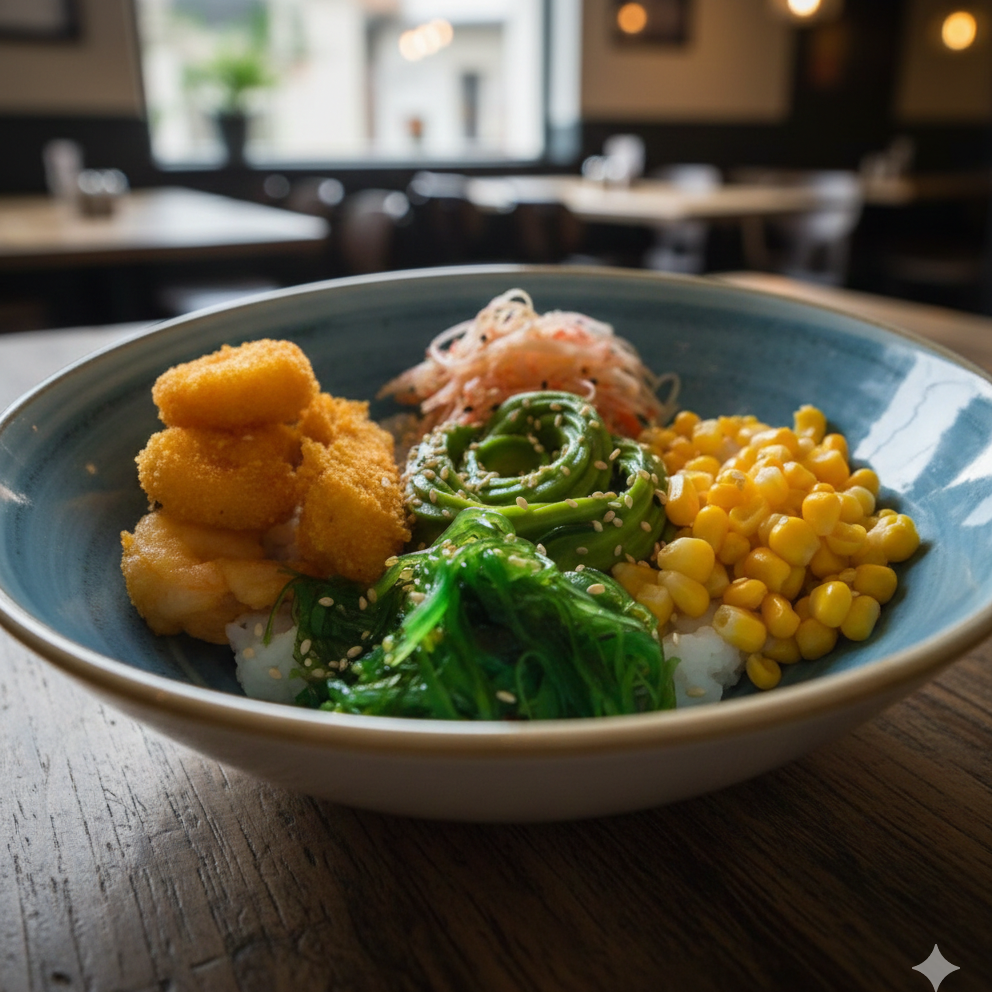 Delicioso camarón apanado, acompañado de maíz dulce, aguacate, ensalada de palmito, wakame.