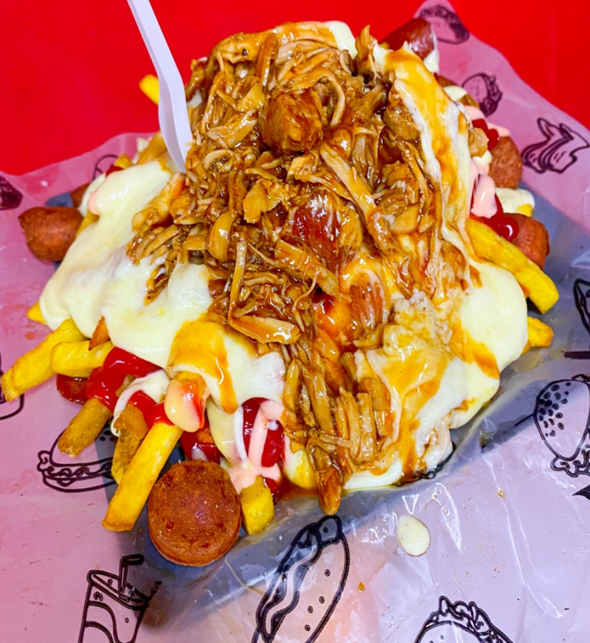 Papa a la francesa, salchicha suiza de pollo, Pierna de Cerdo des mechado aderezada en nuestra salsa Bbq, nuestras salsas de la casa y mucho queso