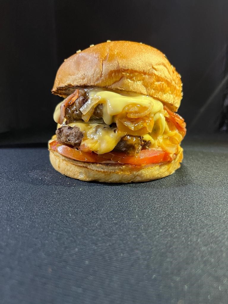 La nueva y la mas solicitada, doble Carne Angus de 140Gr gratinadas en queso americano, en Pan Brioche, tomate fresco, cebolla caramelizada, tocineta premium en tiras y las exclusivas salsas de la casa