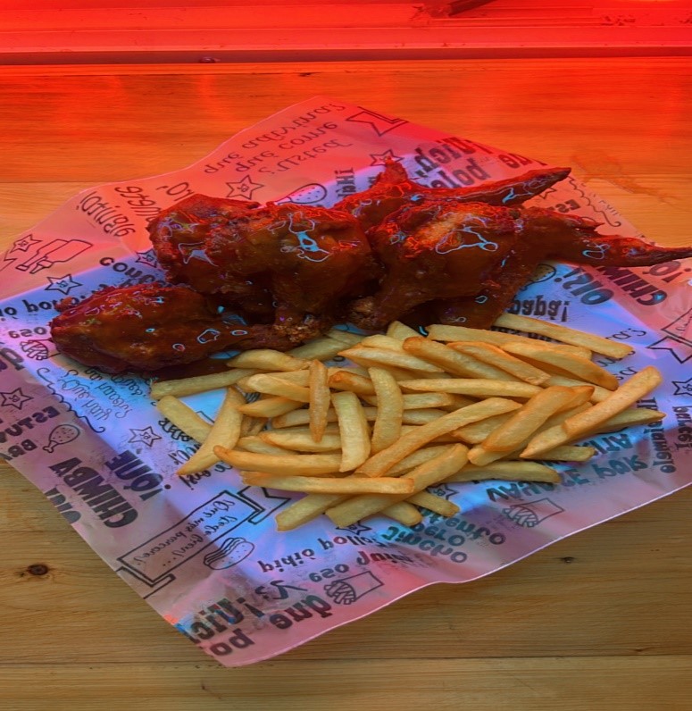 Jugosas alitas de pollo x 6, acompañadas de papa a la francesa, pídela con cualquiera de nuestros sabores ( BBQ clásica, miel mostaza, BBQ red hot).