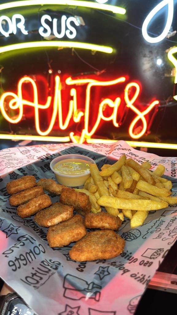 Una gran eleccion para iniciar, Croquetas de pechuga apanada acompañada de Papa Francesa y nuestra salsa estrella de Miel Mostaza