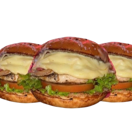 3 Hamburguesas Gallo Claudio con Doble Filete de Pollo asado a la parrilla acompañado de BBQ, Queso Cheddar, Queso mozzarella, Tocineta, Lechuga crespa, cebolla caramelizada, tomate y nuestra salsa miel mostaza