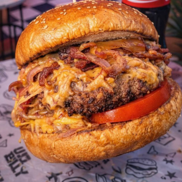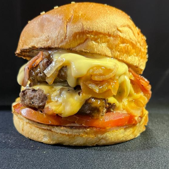 Pan brioche Doble carne Angus(180g) Queso mozzarella, Queso Cheddar, cebolla caramelizada, tomate fresco, tocineta premium, salsas de la casa, ripio de papa y ¡BAÑADA EN QUESO!