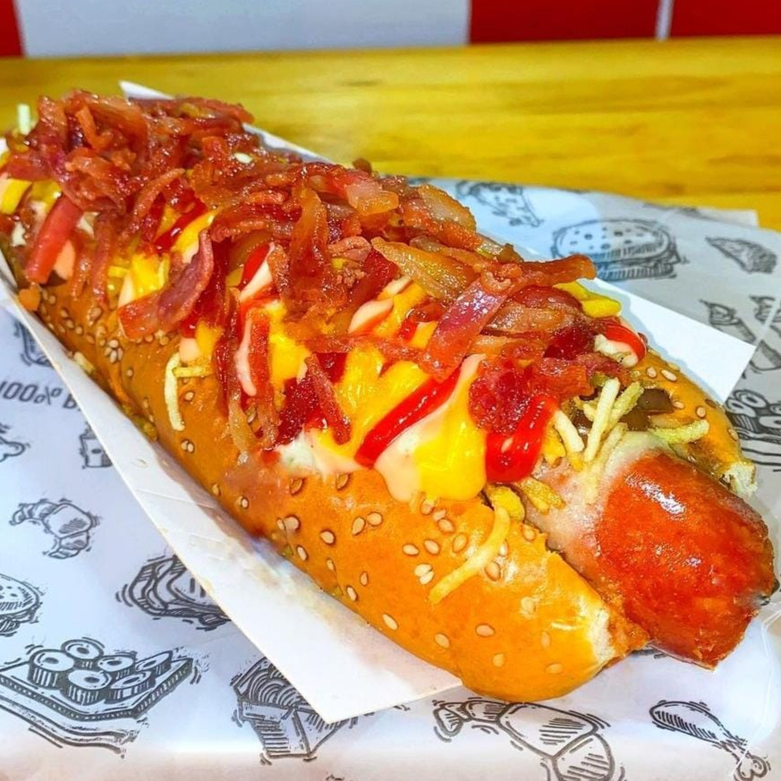 Pan brioche bien dorado y dos salchichas americanas que parecen escapadas de una caricatura retro. Queso que se estira como escena dramática, tocineta crujiente sin modales, cebollita con actitud, ripio explosivo y un baño salvaje de Salsa Yankee, un perro tranquilo por fuera… pero por dentro explota una fiesta que ni Droopy se imaginaba.