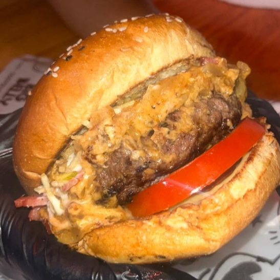 Un torbellino de sabor: Pan brioche, doble carne Angus de 180gr, gratinada con cheddar, tomate, cebolla caramelizada y tocineta crujiente. Todo coronado con nuestras salsas de ajo y miel mostaza. Deliciosamente salvaje, como Taz