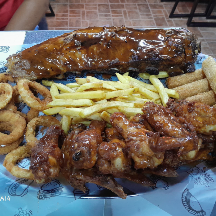 Nuestra Gran Costilla ( corte completo) + 12 alitas + papas a la francesa + aros de cebolla + porcion de yuca + gaseosa 1.5 ml