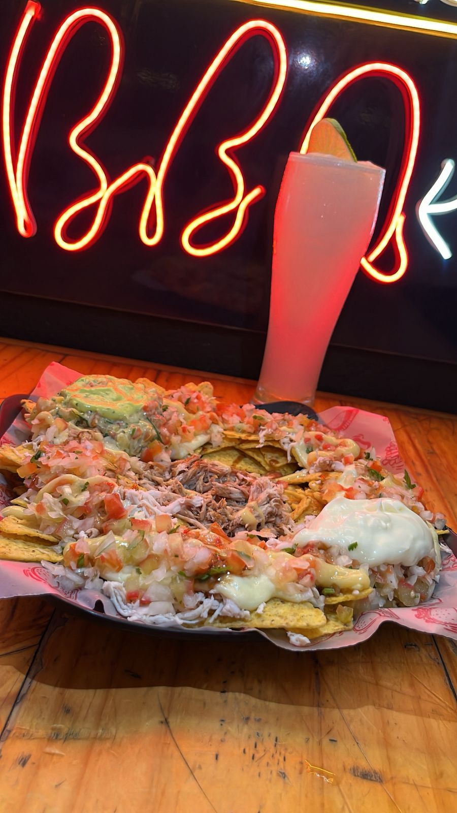 Una de las opciones mas famosas, Totopos de maiz bañados en queso mozarella, acompañados de pierna de cerdo y pollo desmechados, pico de gallo y guacamole de la casa, sour cream y nuestra famosa salsa miel mostaza y Bbq + Limonada
