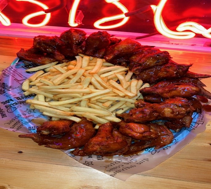 Jugosas alitas de pollo x 24, acompañadas de papa a la francesa, pídela con cualquiera de nuestros sabores ( BBQ clásica, miel mostaza, BBQ red hot).