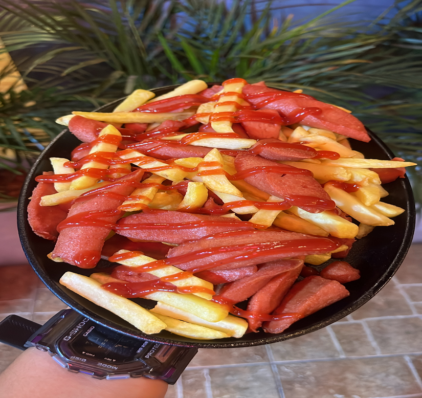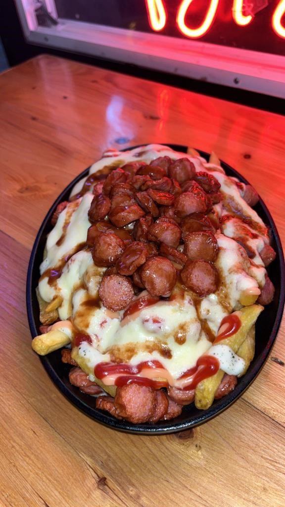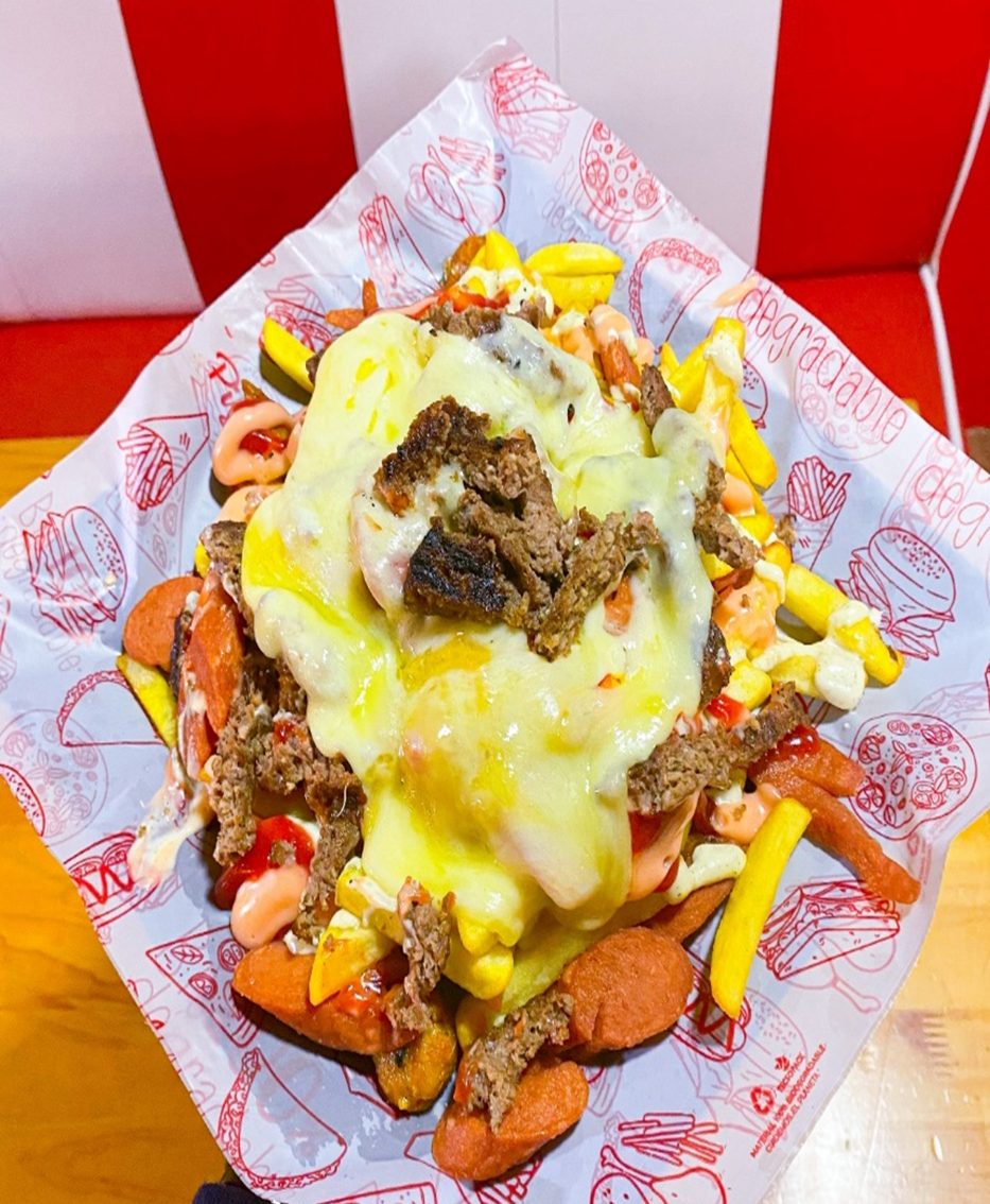 Papa a la francesa, salchicha suiza de pollo, carne de hamburguesa Angus. nuestras salsas de la casa y mucho queso