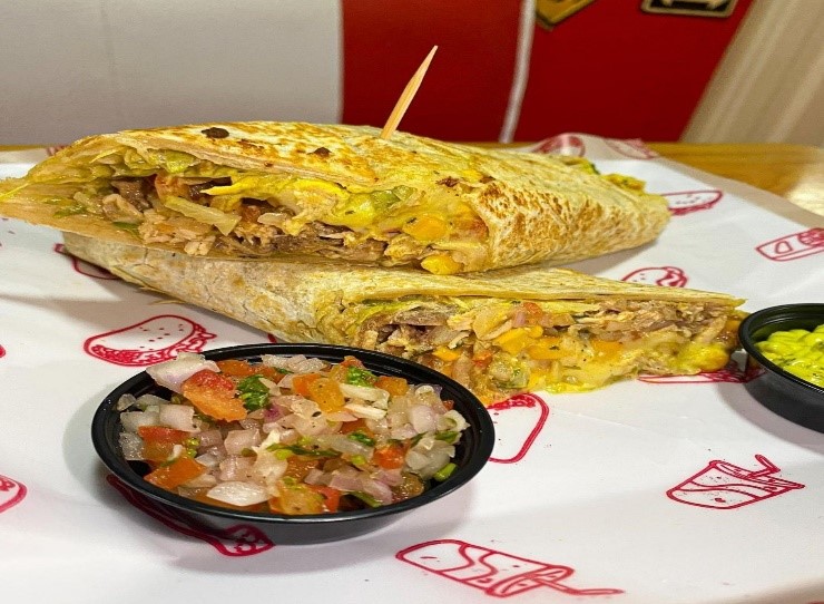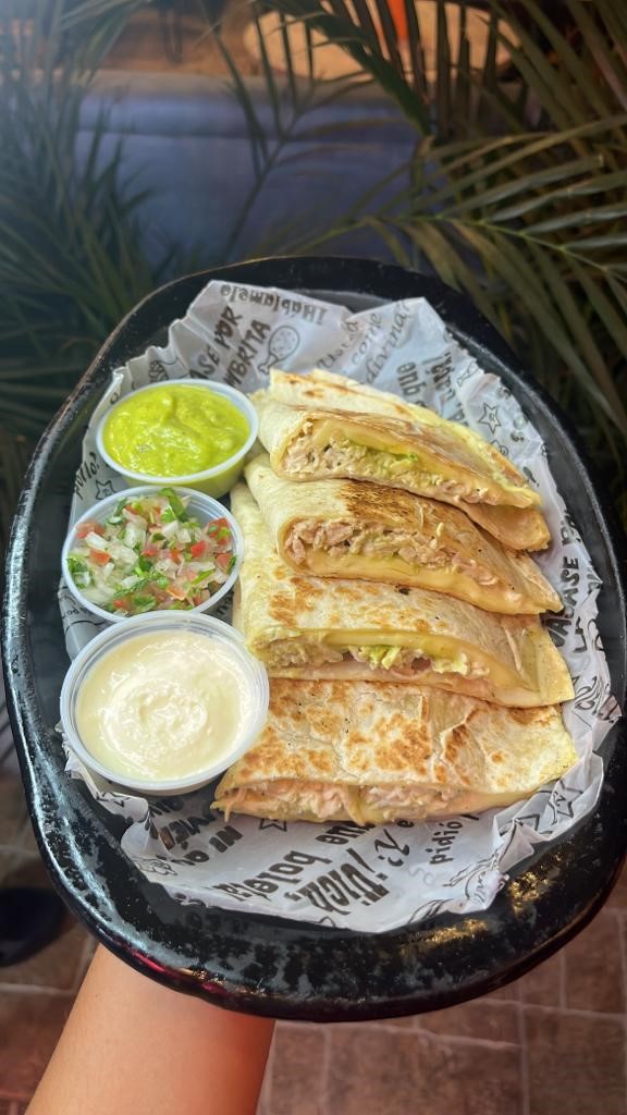 La entrada perfecta para compartir, toritall grande de trigo rellena de sour cream pollo desmechado, guacamole de la casa y queso mozarella, acompañada de guacamole y pico de gallo de la casa