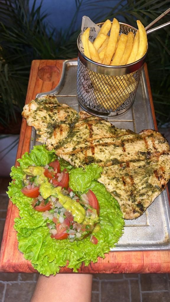250Gr de jugosa Pechuga a la parrilla, acompañado de papa a la francesa y ensalada de la casa