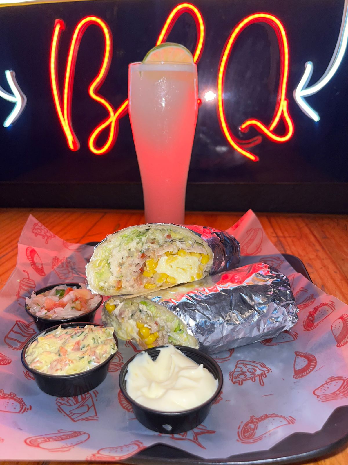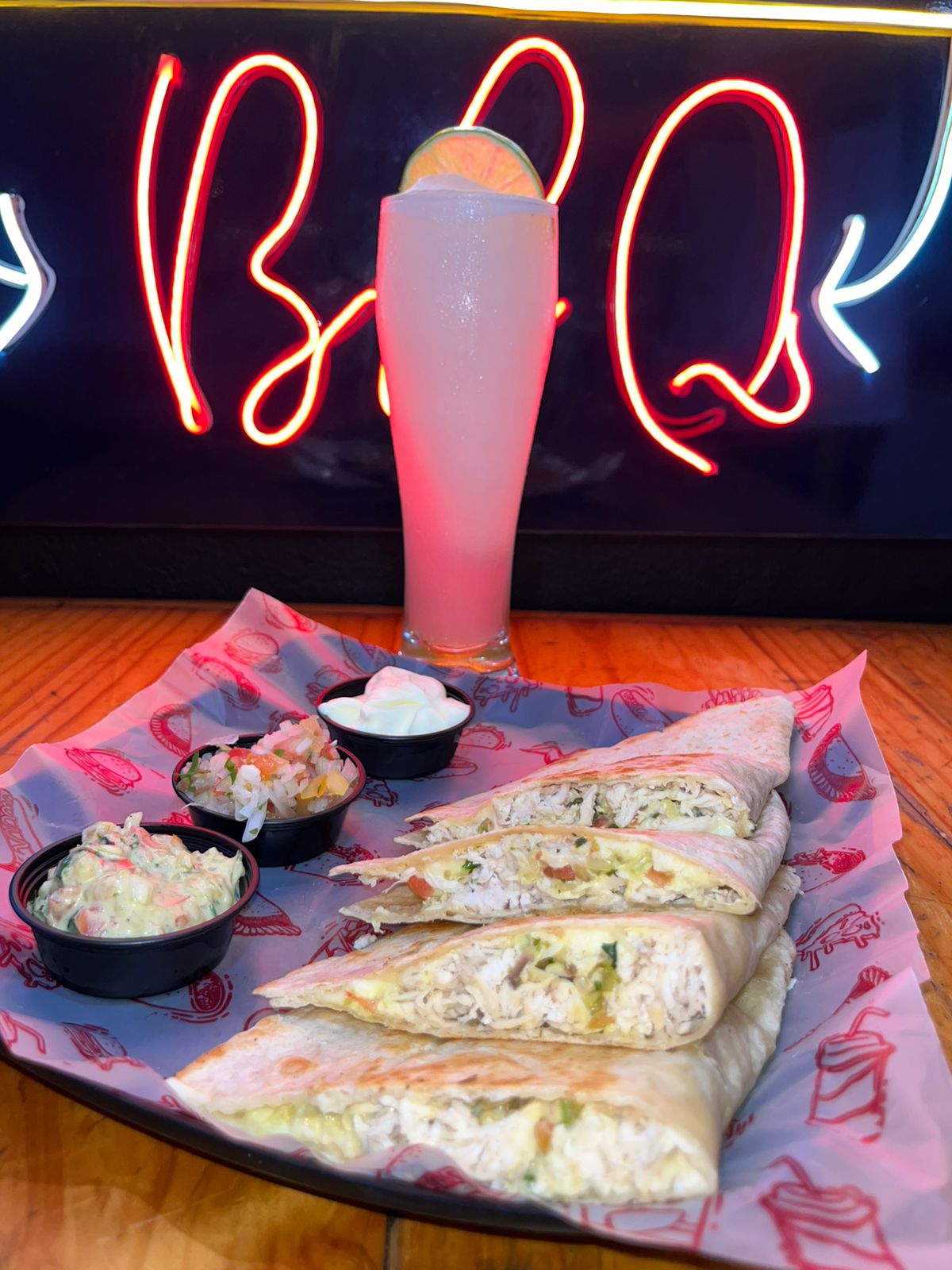 La mejor opcion para probar algo diferente, tortilla de trigo rellena de perna de cerdo desmechada y pollo adereados en nuestra salsa Bbq, maiz tierno dulce, sour cream, lechuga batavia, guacamole y pico de gallo de la casa y mucho queso; acompañado de Guacamole y Sour Cream + Limonada