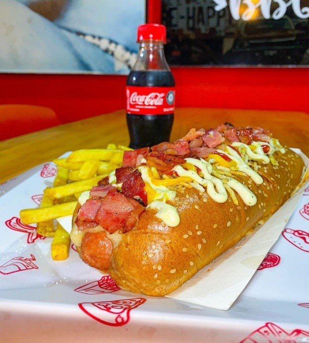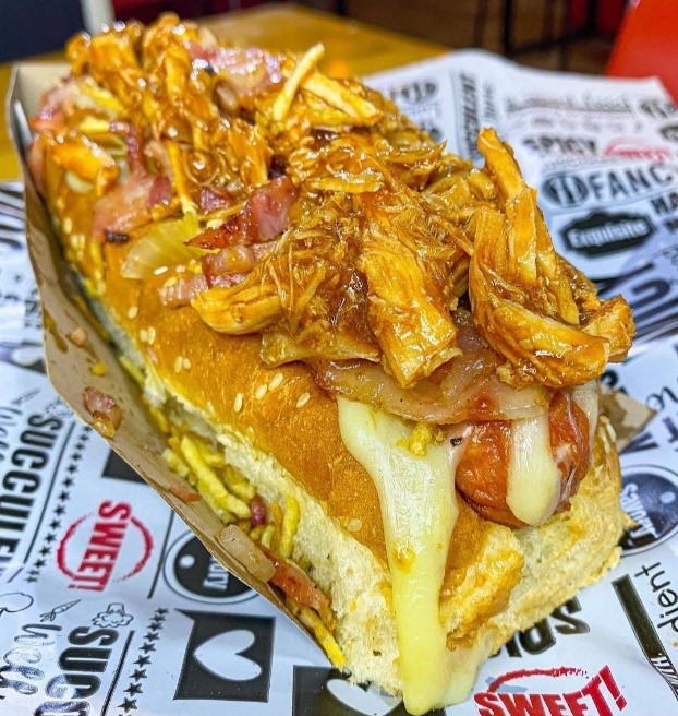 Sin duda alguna el mas grade, salchicha Americana en Pan Brioche, pierna de cerdo desmechado aderezada en nuestra salsa Bbq de la csa, queso mozarella, tocineta premiun, cebolla caramelizada, ripio de papa, salsa de la casa y piña