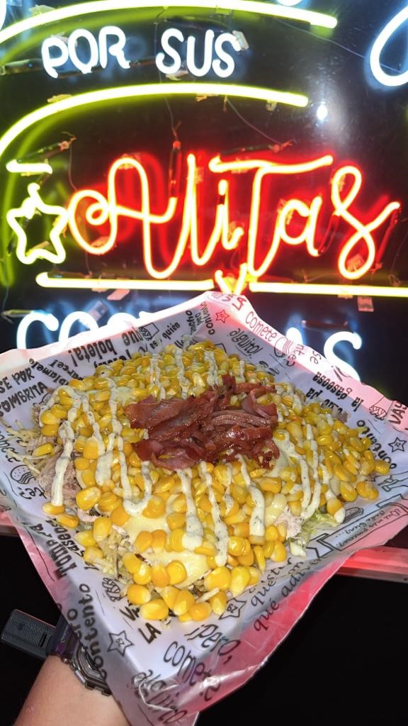 Papa a la francesa, pollo desmechado, carne tipo hamburguesa en trozos, suiza de pollo, salchicha americana, queso fundido, tocineta , ripio de papa, lechuga, maiz dulce, pico de gallo, guacamole y salsas de la casa + Gaseosa 1.5Lt.