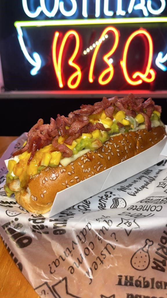 Nuevo original y como ninguno salchicha americana, en Pan Brioche, queso mozarella, pico de gallo y guacamole de la casa, maiz dulce, sour cream, ripio de papa, un toque de salsa Bbq, picante suave y piña