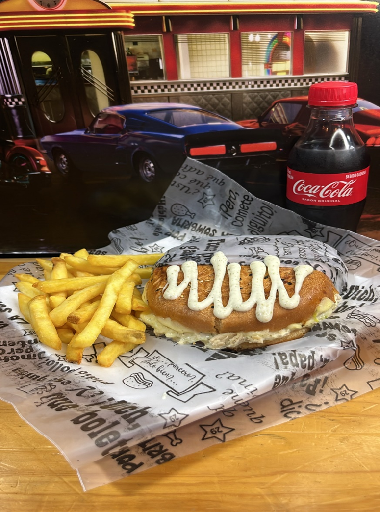 Una gran eleccion, Pollo desmechado en Pan Brioche, lechuga batavia, tomate fresco, queso mozarella, ripio de papa y salsa de la casa; acompañado de papa a la francesa + Gaseosa 250ml