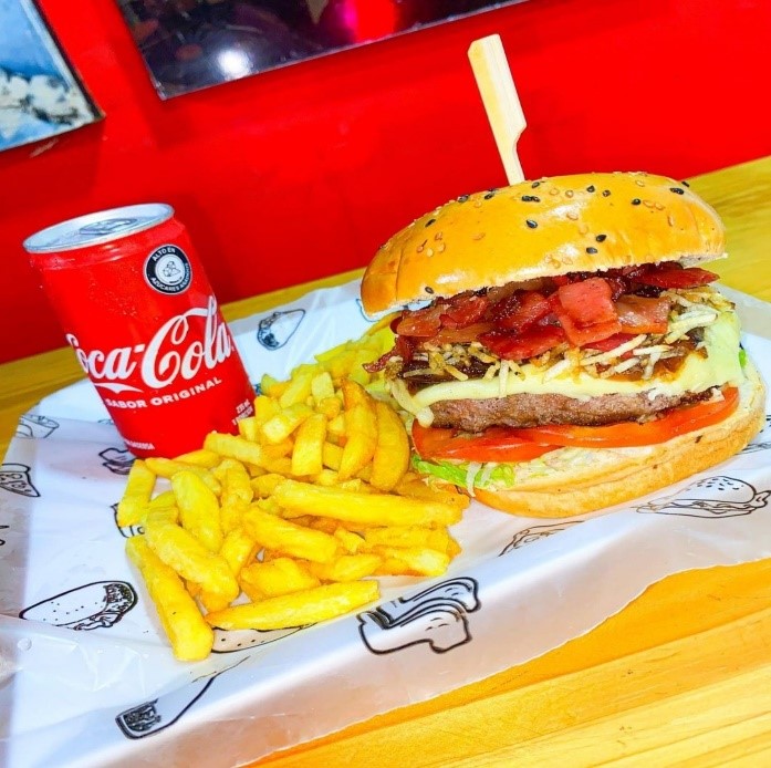 Una de las mas grandes de la casa, doble Carne Angus 140gr en Pan Brioche, lechuga crespa, tomate fresco, cebolla carameliza, tocineta premiun, ripio de papa, queso mozarella y salsa de la casa