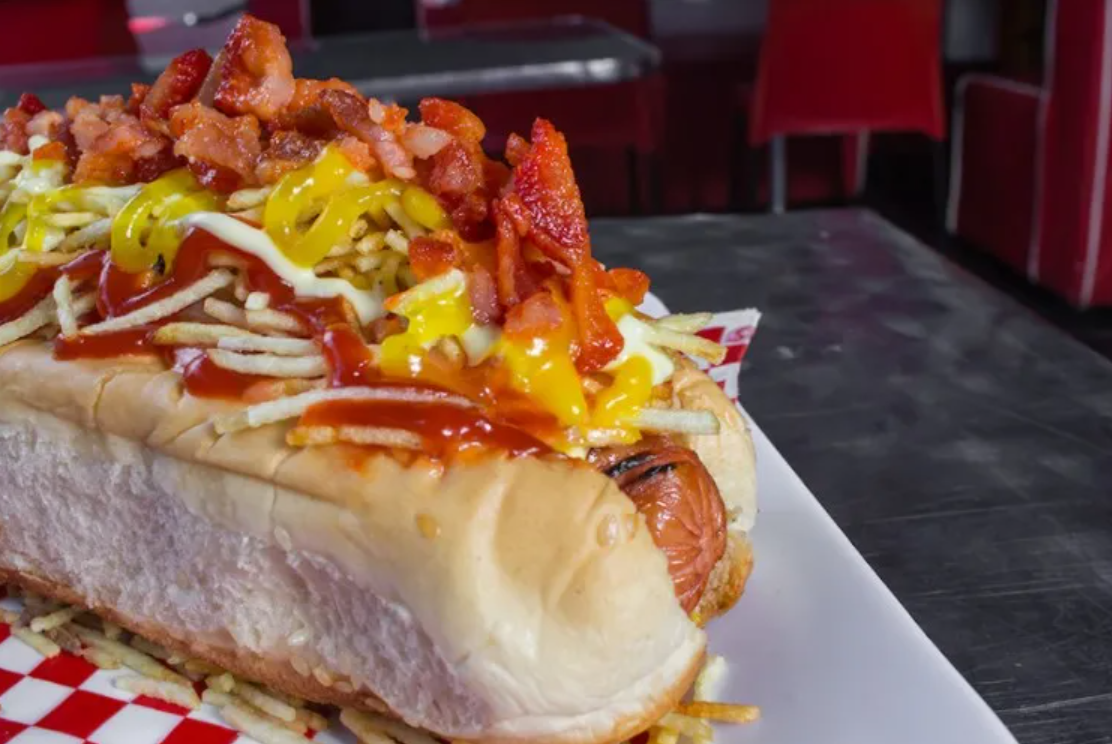 Salchicha Americana, en Pan Brioche, tocineta premiun en trozos, quesos mozarella, cebolla caramelizada, ripio de papa, salsa de la casa y piña