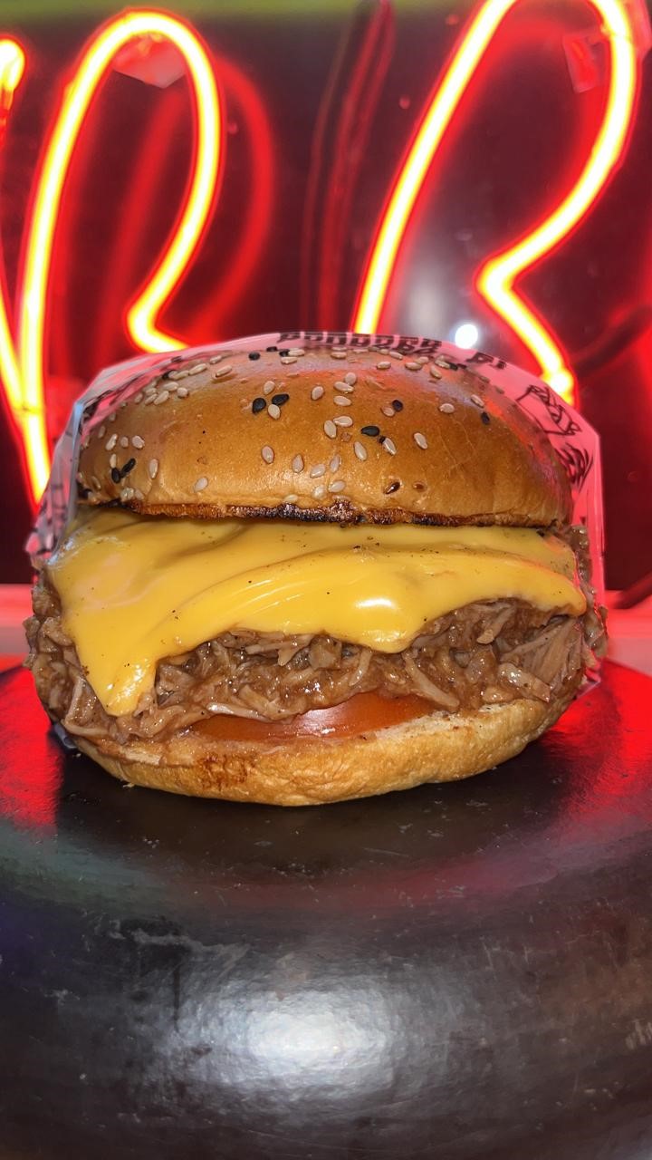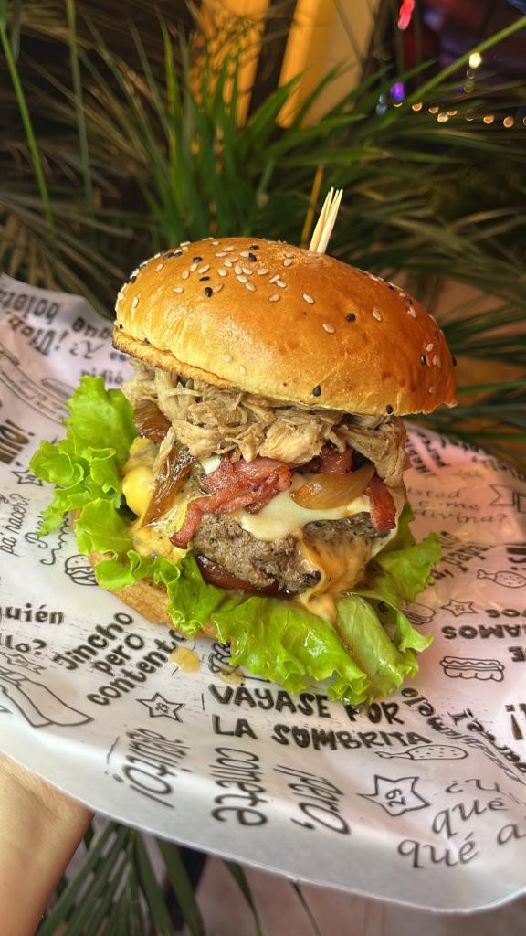 Sin duda alguna la mas grande de todas con una sobredosis de queso mozarella, doble Carne Angus 140Gr, pierda de Cerdo Desmechado en salsa BBQ de la casa, lechuga crespa, tomate fresco, tocineta premiun, ripio de papa, cebolla caramilizada y salsa de la casa