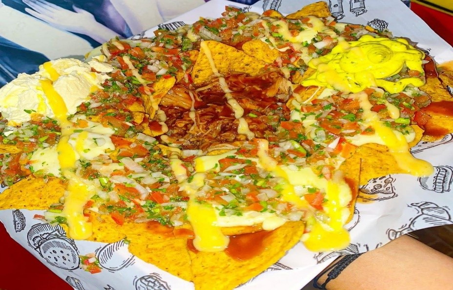 Una de las opciones mas famosas, Totopos de maiz bañados en queso mozarella, acompañados de pierna de cerdo y pollo desmechados, pico de gallo y guacamole de la casa, sour cream y nuestra famosa salsa miel mostaza y Bbq