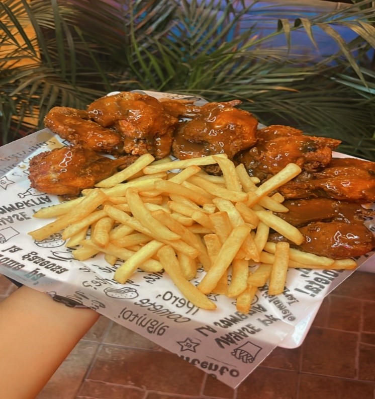 Jugosas alitas de pollo x 6, acompañadas de papa a la francesa, pídela con cualquiera de nuestros sabores ( BBQ clásica, miel mostaza, BBQ red hot).