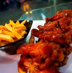 Jugosas alitas de pollo x 24, acompañadas de papa a la francesa, pídela con cualquiera de nuestros sabores ( BBQ clásica, miel mostaza, BBQ red hot).