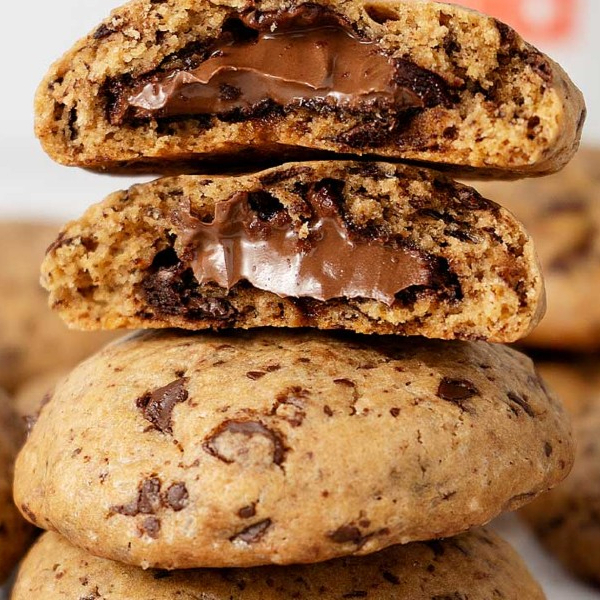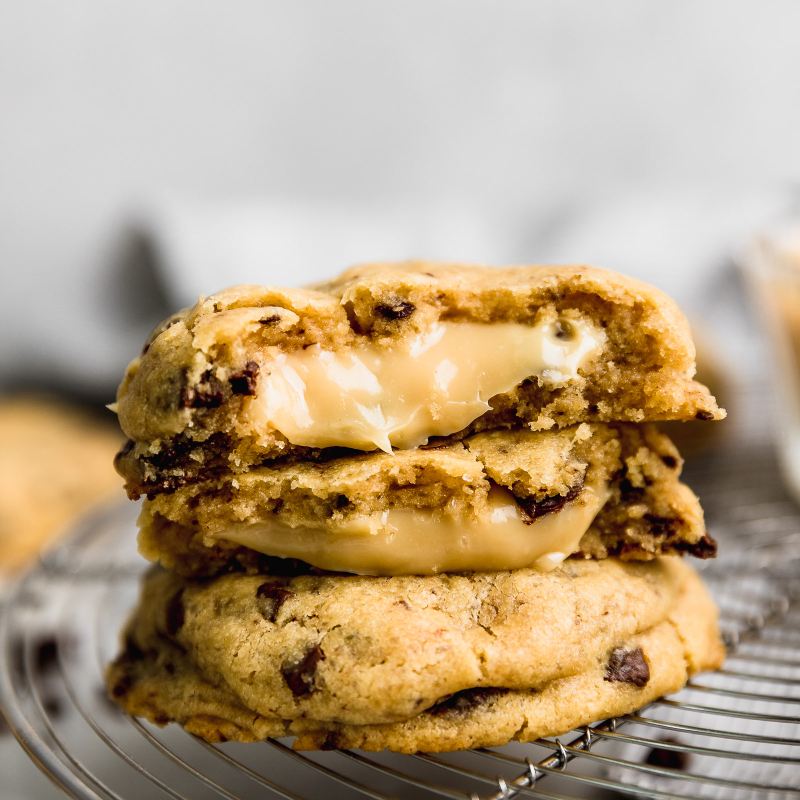 galleta estilo ny de macadamia con coco rellena de caramelo salado