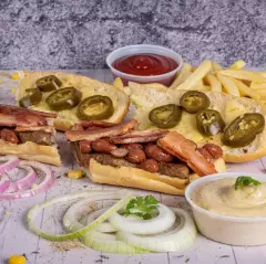 Frijoles, carne de hamburguesa, tocineta, queso, lechuga, jalapeños y salsa de ajo.