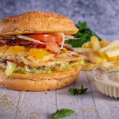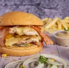 Delicioso filete de pollo doble porción, tocineta, doble queso crema, piña, cebolla morada, lechuga, tomate y salsas
