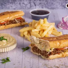 Cordero pierna, jamón cordero, queso, lechuga y salsa de ajo.
