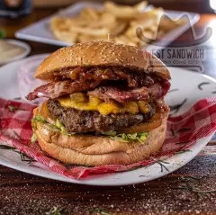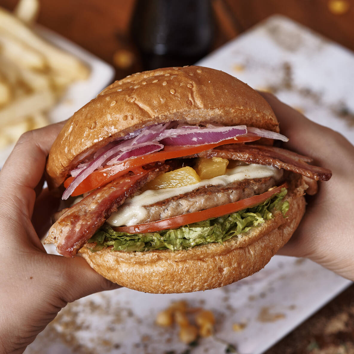 Deliciosa doble carne de res con cerdo, tocineta, doble queso crema, piña, cebolla morada, lechuga, tomate y salsas