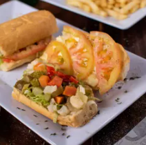 Sandwich de 35 cm con, Encurtido, queso, lechuga, tomate y salsa de ajo.